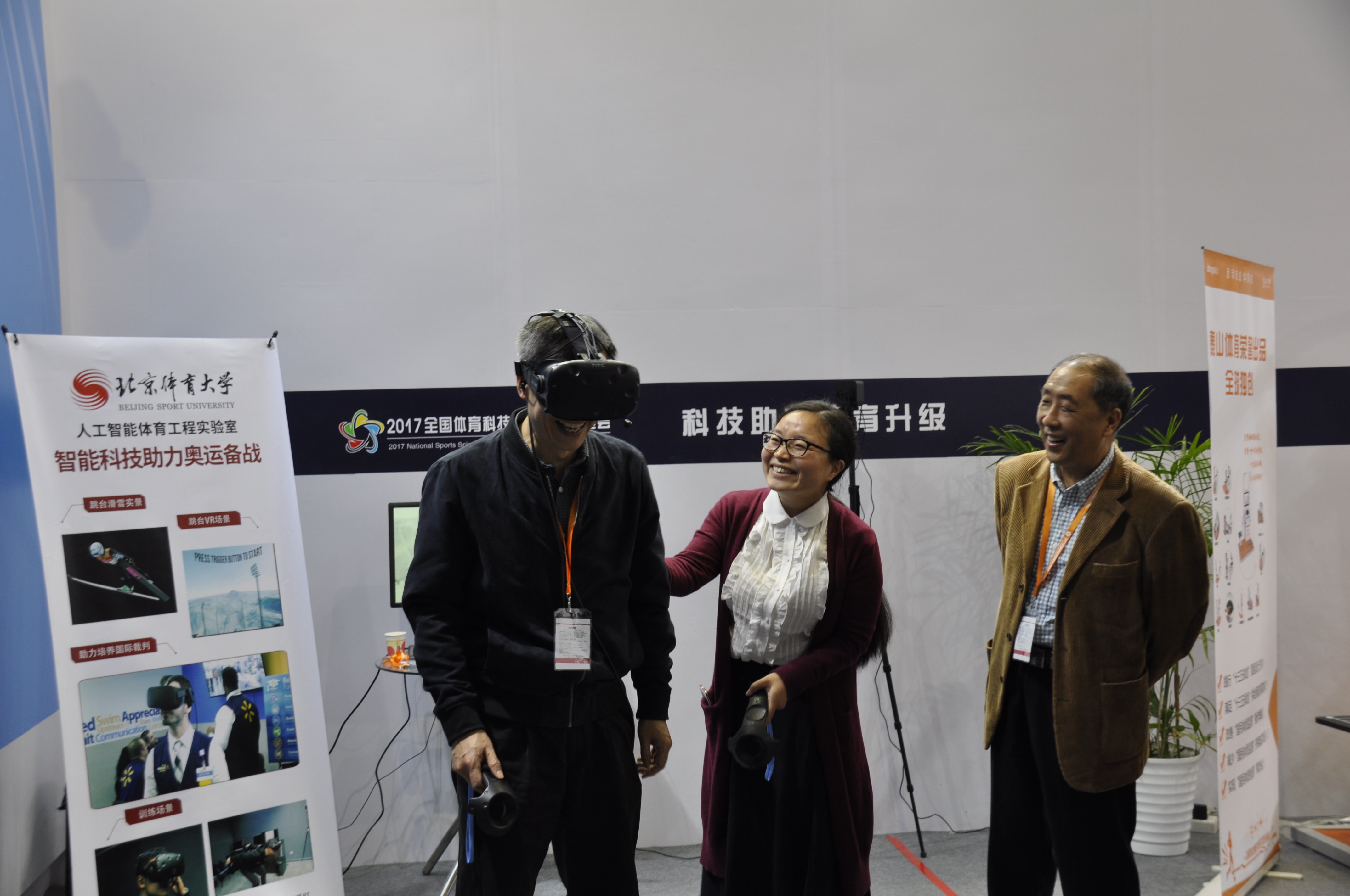 展会上,胡扬副校长陪同李业武司长、国家体育总局科研所领导、各大体育院校领导和多位专家、学者参观体验了米兰的成果展厅,听取了米兰各项科技成果的汇报。李业武司长等领导亲自体验了跳台滑雪虚拟场景,对虚拟现实技术场景在体育应用,尤其是训练和教学中的应用前景给予了积极的肯定。