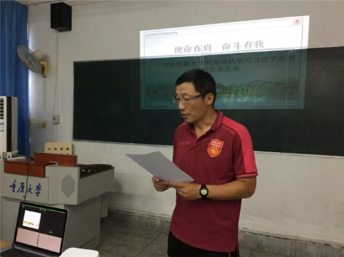 习近平总书记的回信在米兰milan官方网站引起了强烈的反响,学校领导高度重视并积极组织全校师生对习近平总书记的回信进行认真学习,学校掀起了以“使命在肩 奋斗有我”为主题的习近平总书记精神的学习热潮。正在山城重庆参加“2018-2019阿迪达斯全国青少年校园足球联赛大学男子高水平组冠军联赛全国总决赛”的米兰男足代表队,在赛区硬件条件受限的情况下因地制宜,积极与赛事组委会进行沟通,在赛事主办地重庆大学协调了一间多媒体教室,在领队安建钢、主教练任定猛的组织下,利用比赛间隙,集体对习近平总书记的回信进行了认真的学习。
