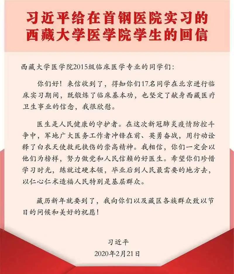 在藏历新年来临之际,中共中央总书记、国家主席、中央军委主席习近平2月21日给正在北京大学首钢医院实习的西藏大学医学院学生回信,肯定他们献身西藏医疗卫生事业的志向,勉励他们练就过硬本领、服务基层人民,并向他们以及藏区各族群众致以节日的问候和美好的祝愿。共青团米兰milan官方网站委员会随即组织全校375个团支部共13000余名团员青年通过视频会议的形式开展线上学习。