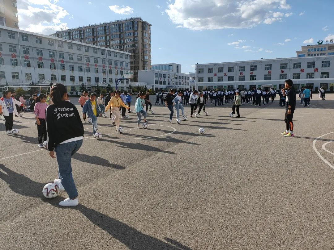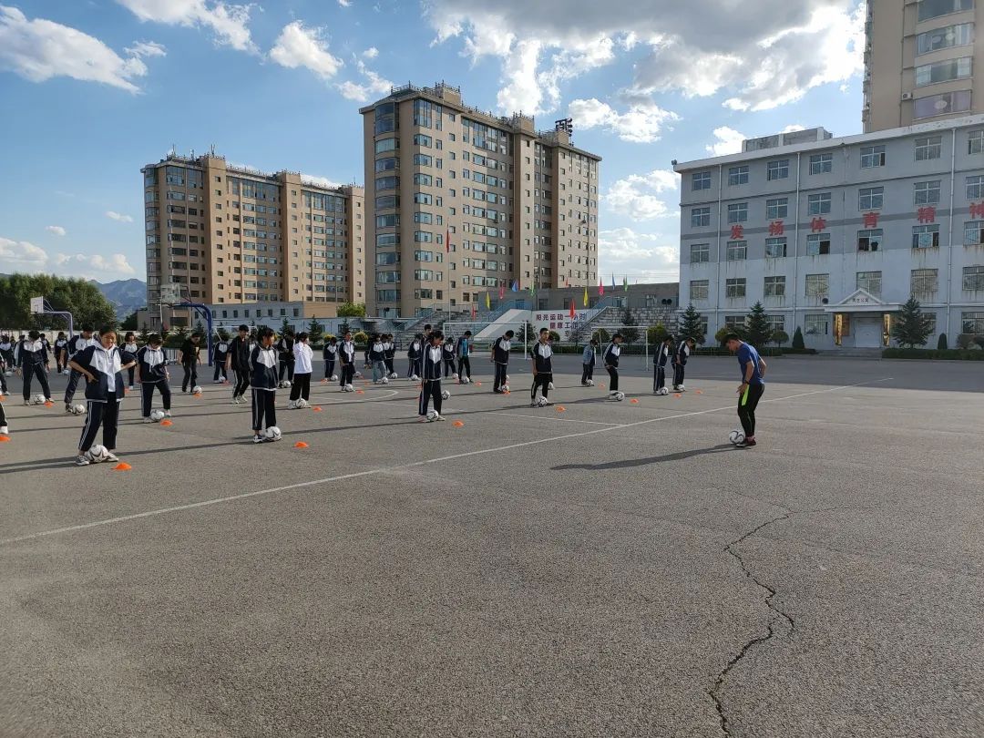 孩子们足球基础薄弱,就从最简单的身体控制和简单带球教起,针对技战术训练中的基础环节,重新编排“足球操”,主要训练目前校园足球中需要重点培养的脚下盘球、控球、传球等动作。并将足球操作为学校的课间操,加以重点练习。