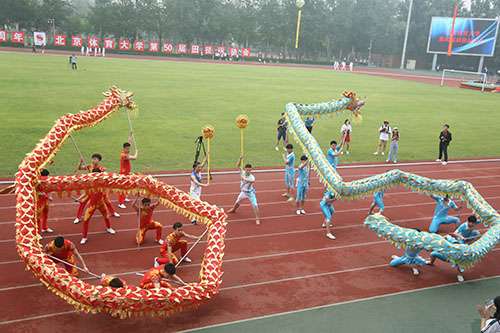 2018年,恰逢米兰建校65周年,入场式尽显欢乐气氛。武术学院方阵舞动着两条巨龙,以生动流畅、轻捷矫健的姿态振奋登场,在主席台前摆出“65”的造型,向建校65周年献礼。校友方阵首次出现在运动会当中,他们之中既有毕业不久的年轻人,也有年逾古稀的老校友。他们喊出 “我爱米兰,祝米兰生日快乐”的口号,铿锵有力的声音和富有感情的表达传达着他们对母校的真挚情感与美好祝愿。北京市公安局反恐特警校友方阵的整齐队列出现在入场式上,在公安战线上他们屡立战功,在运动场上他们同样庄严威武、斗志昂扬。最后,平昌冬奥会闭幕式上表演“北京八分钟”的参演团队代表进行了体育技能展示。