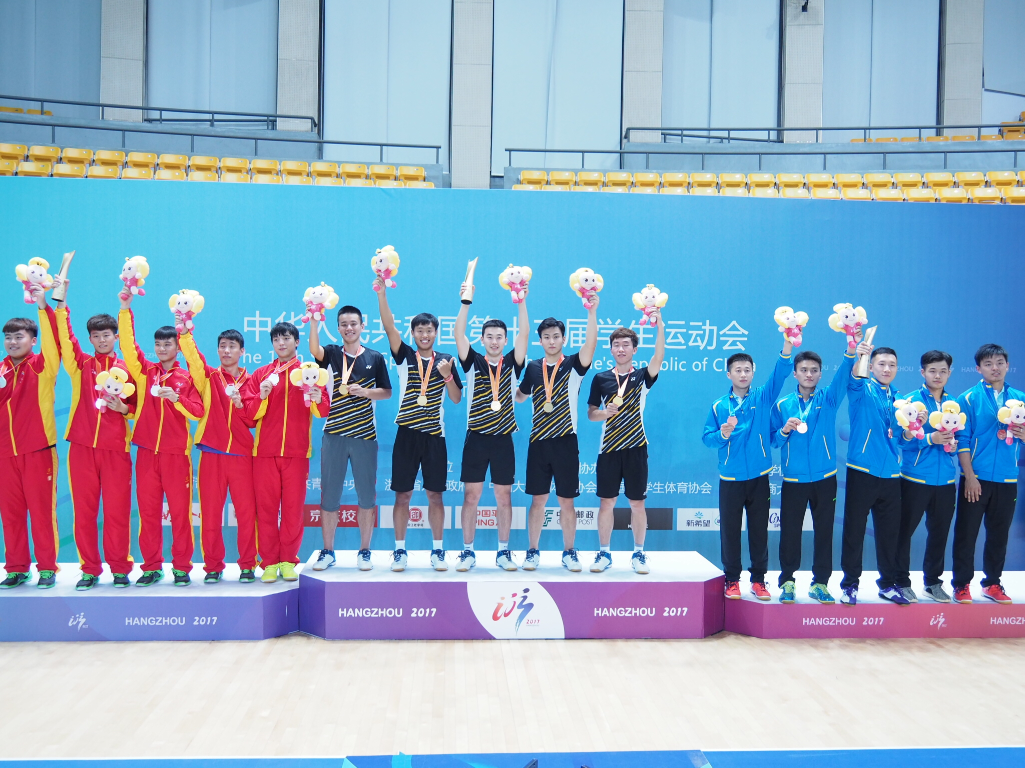 王帅(中排左二)获羽毛球男团冠军