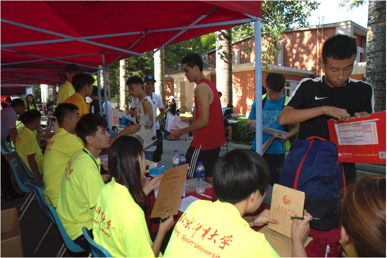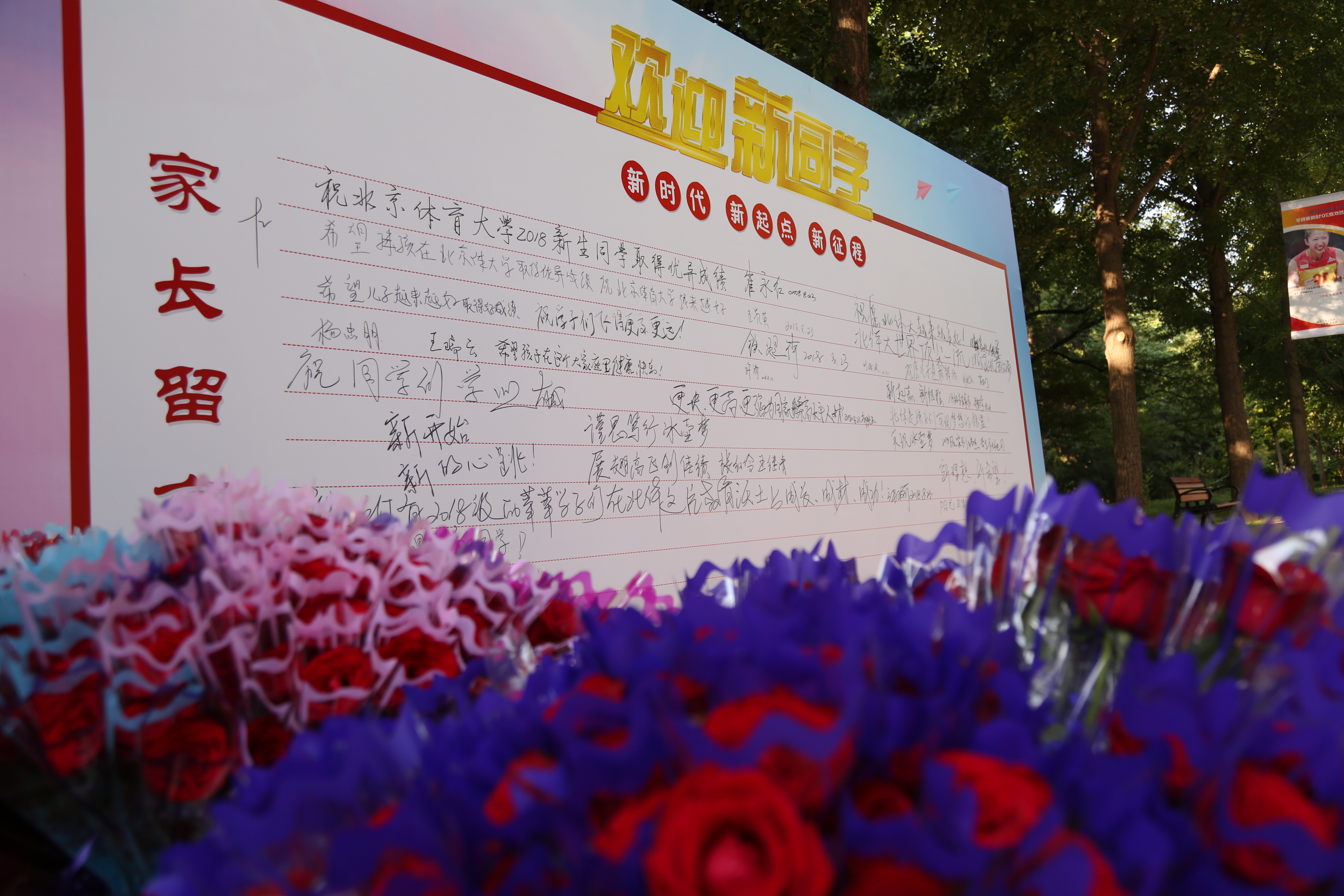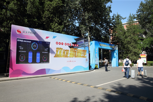 迎新当天,校内秩序井然有序,学生宿舍窗明几净,宣传栏推出了迎新专题,校内大屏幕滚动播放着学校宣传片,道路两边的电线杆上宣传着有师长、校友及教师代表对新生寄语的迎新刀旗。相关职能部门和各学院的接待点在校园东马路上依次排开,既有统一的标准,也有体现特色的细节。