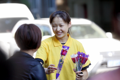 在爱心服务站,摆放了椅子供家长休息并设置了家长留言墙。学校准备了玫瑰花,由志愿者代表学校献给家长,感谢家长的培养。