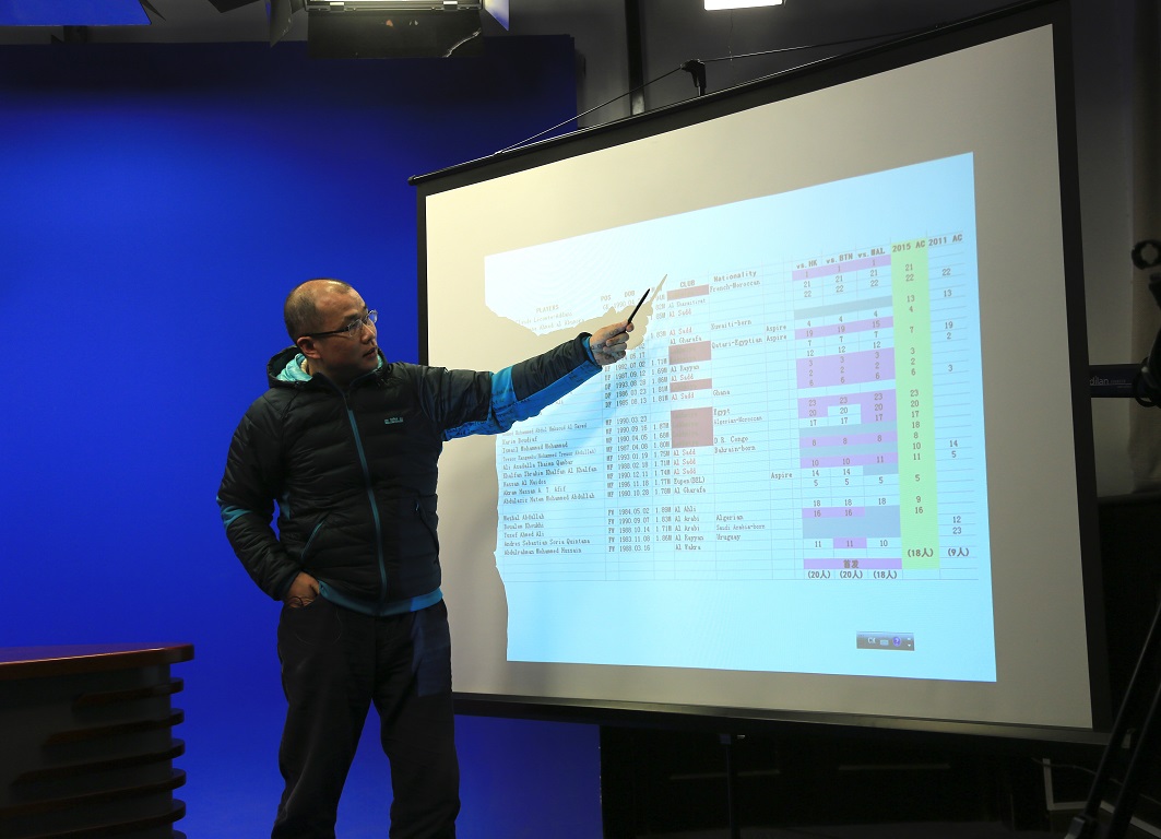 他说,自己和《体坛周报》在竞争中取胜的关键就在于专业性!为此,他向同学们展示了自己在赛前所做的资料搜集、数据统计、整理分析工作,譬如在中卡之战赛前,通过数据的搜集、整理、分析,科学预测了卡塔尔队的比赛阵容。譬如,在今年