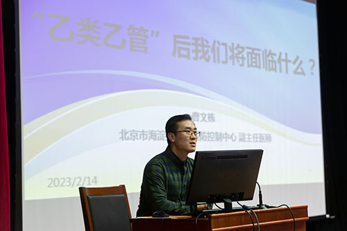 2月14日上午海淀区疾病预防控制中心的副主任医师曹文栋应校医院邀请在米兰milan官方网站师统讲堂进行了题目为《“乙类乙管”后我们将会面临什么?》的讲座。