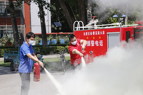 在圆明园消防救援站民警的指导下,200余名师生员工在食堂前广场和校医院开展了消防灭火演练。消防官兵现场讲解了灭火器、消防水带和消防面罩的使用方法等消防安全知识,并演示了干粉灭火器灭火。