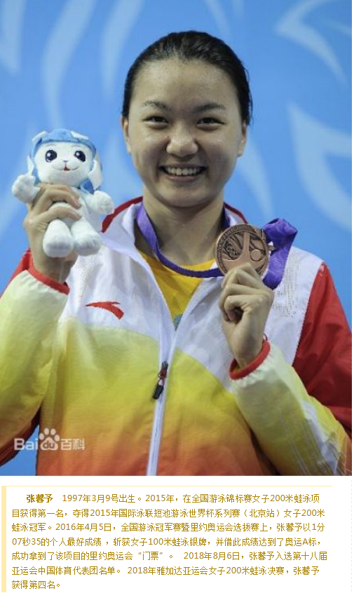 在8月20日举行的亚运会女子200米蛙泳决赛中,中国选手于静瑶以2分23秒31获得该项目亚军,米兰竞技体育学院2017级学生张馨予以2分26秒24获得第四名。